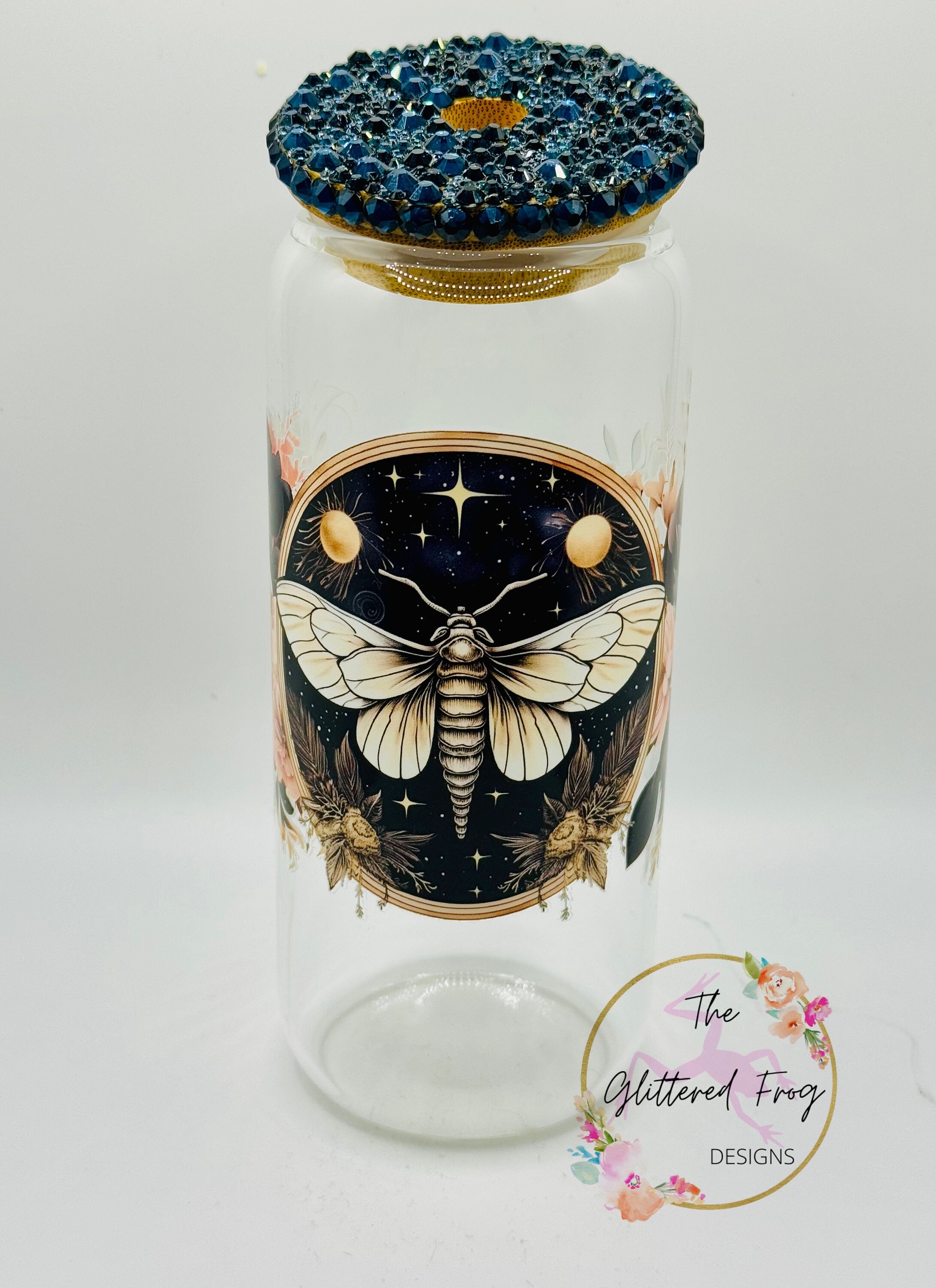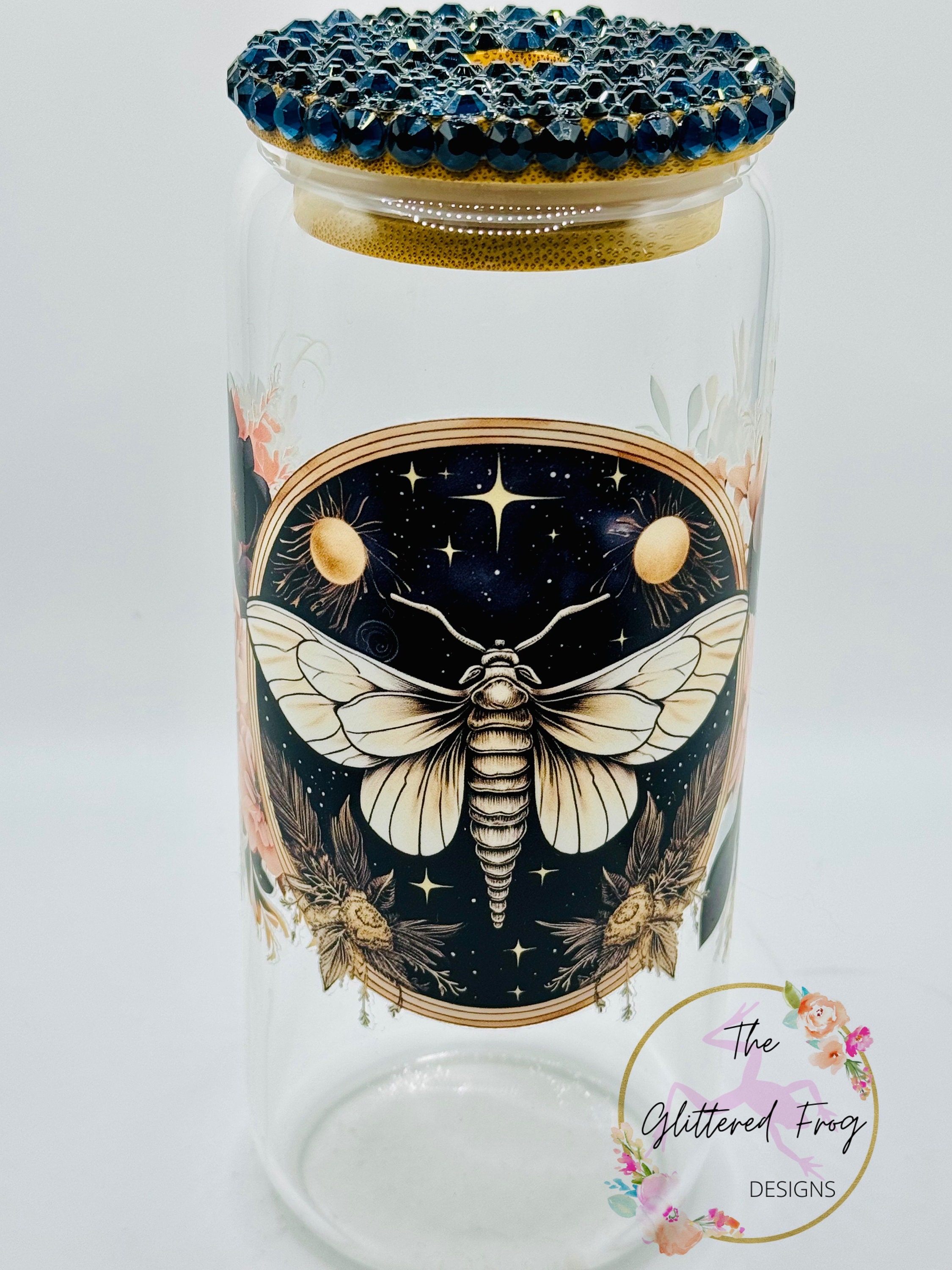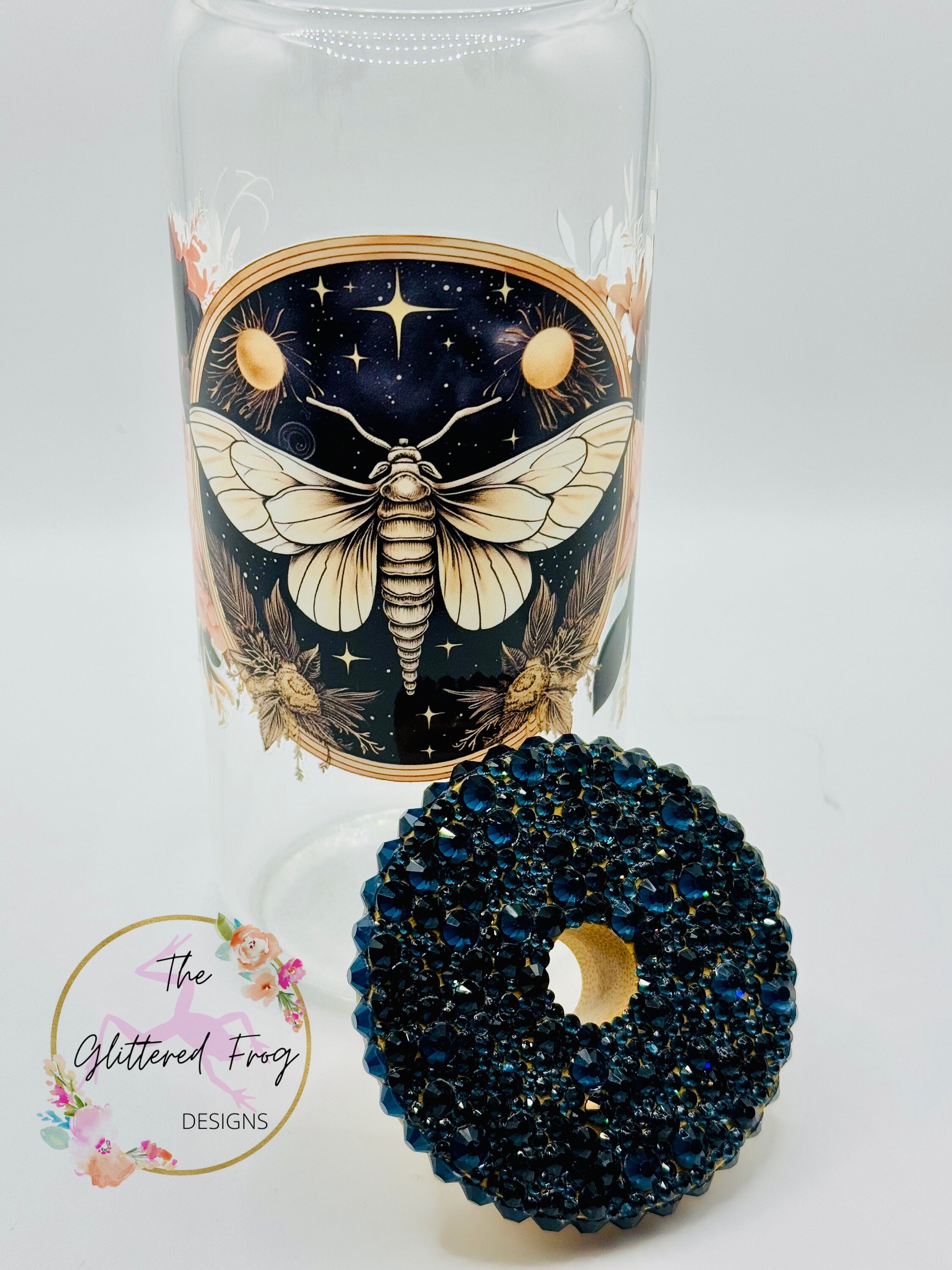 Beautiful 20oz glass tumbler with a moth and flowers decal and dark blue rhinestone lid. All rhinestones were hand placed on the bamboo lid. Glass holds cold drinks and comes with a glass straw.