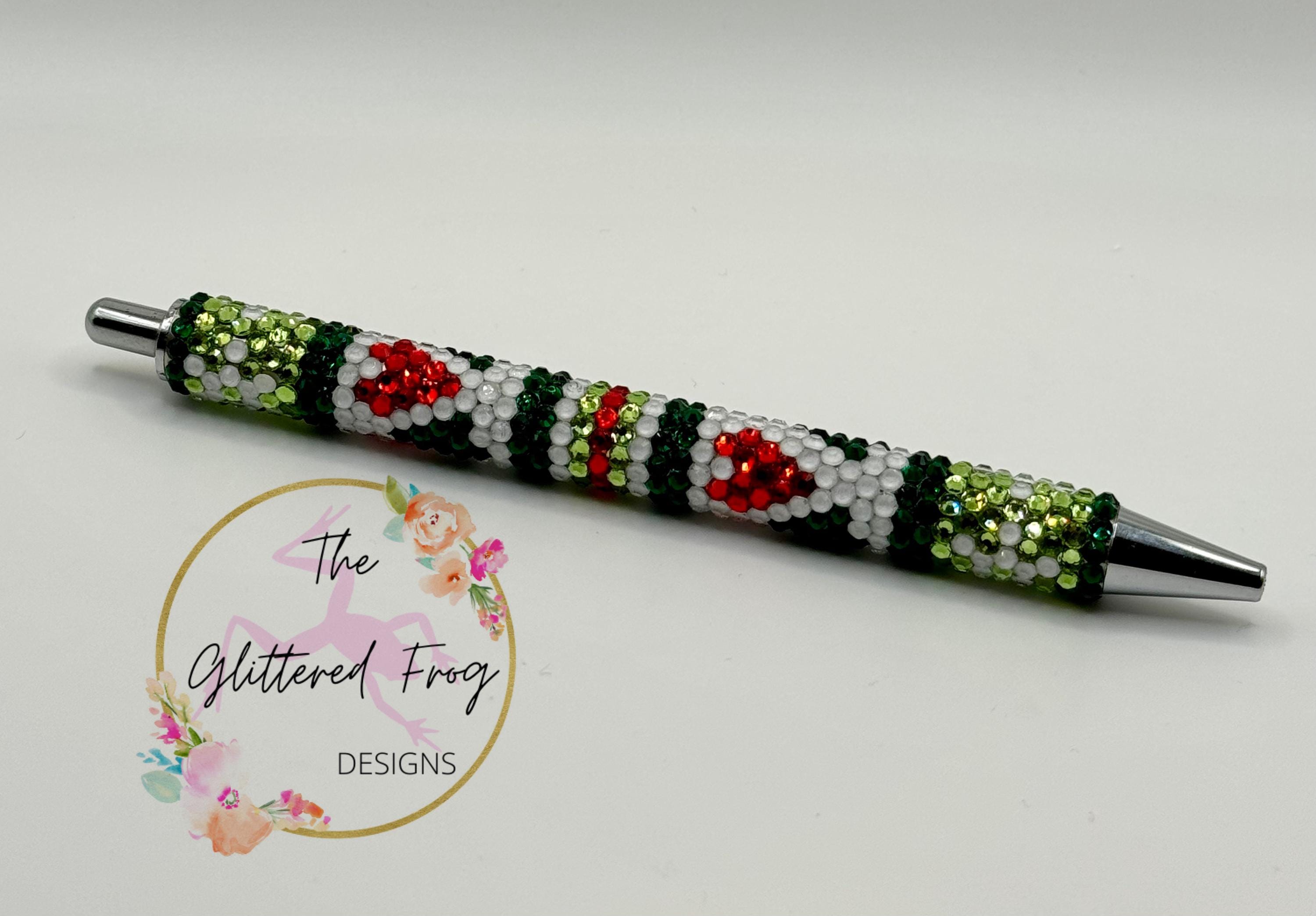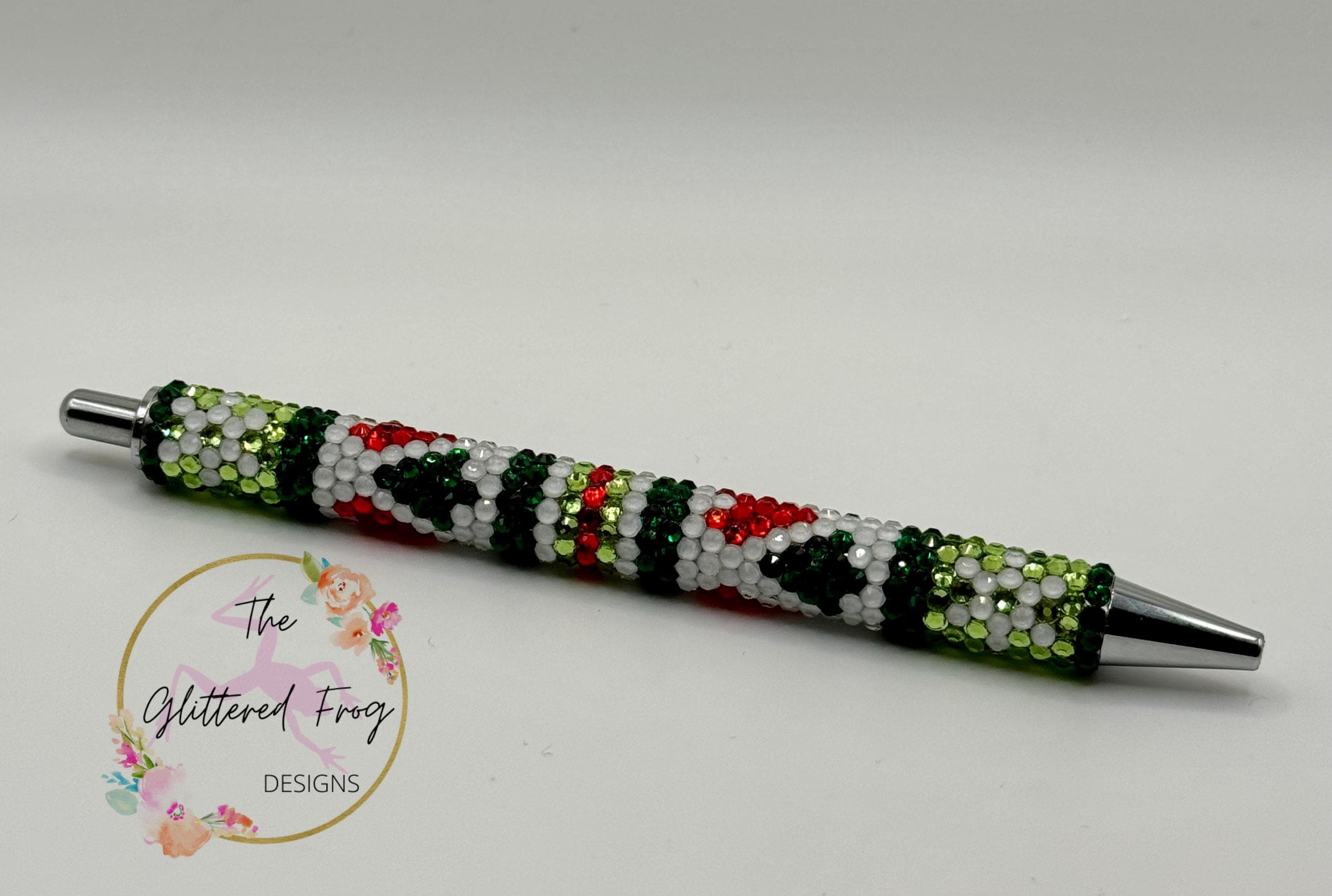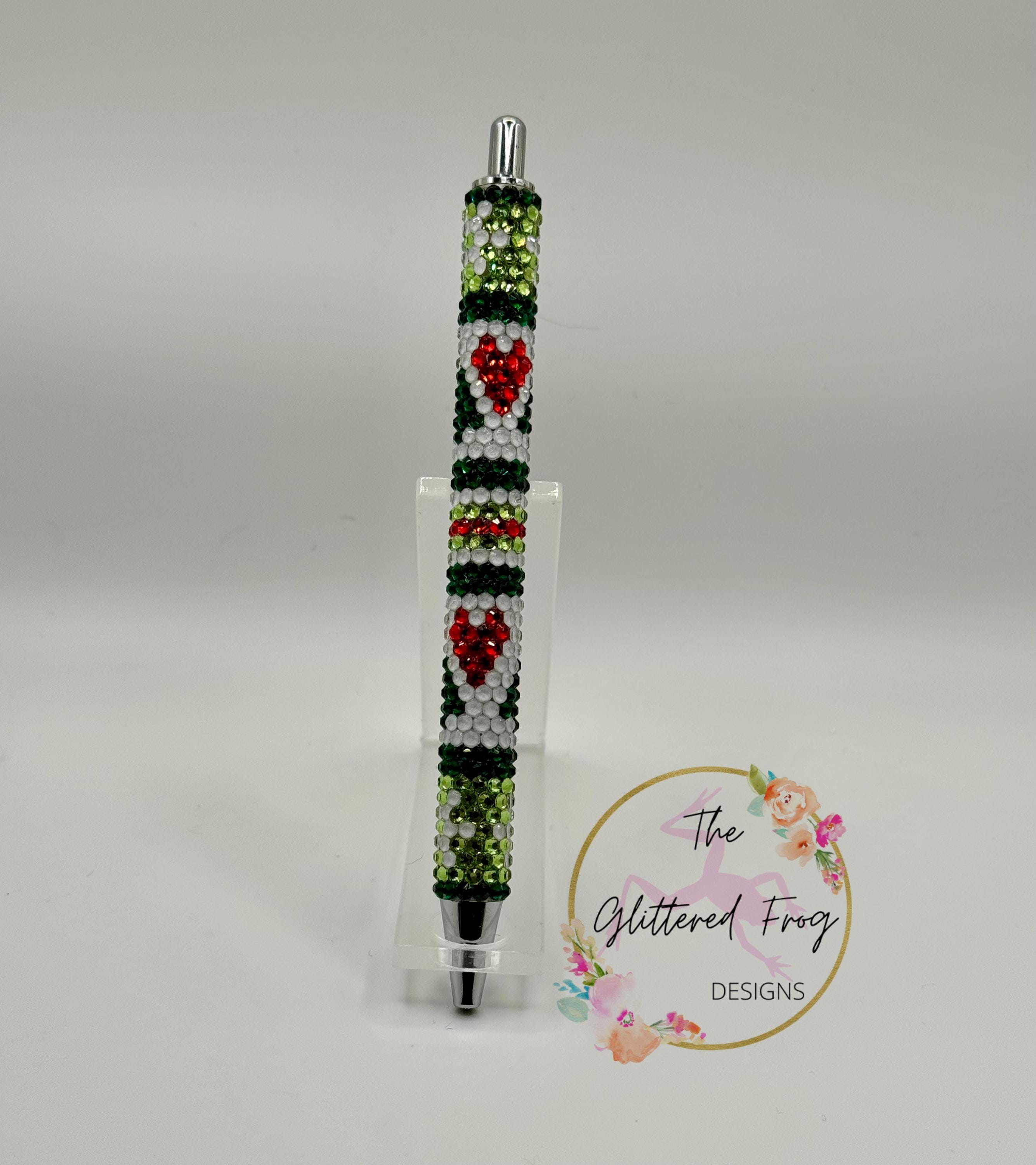 Fun and festive rhinestone pen that has hearts, stripes, snowflakes and Christmas trees.