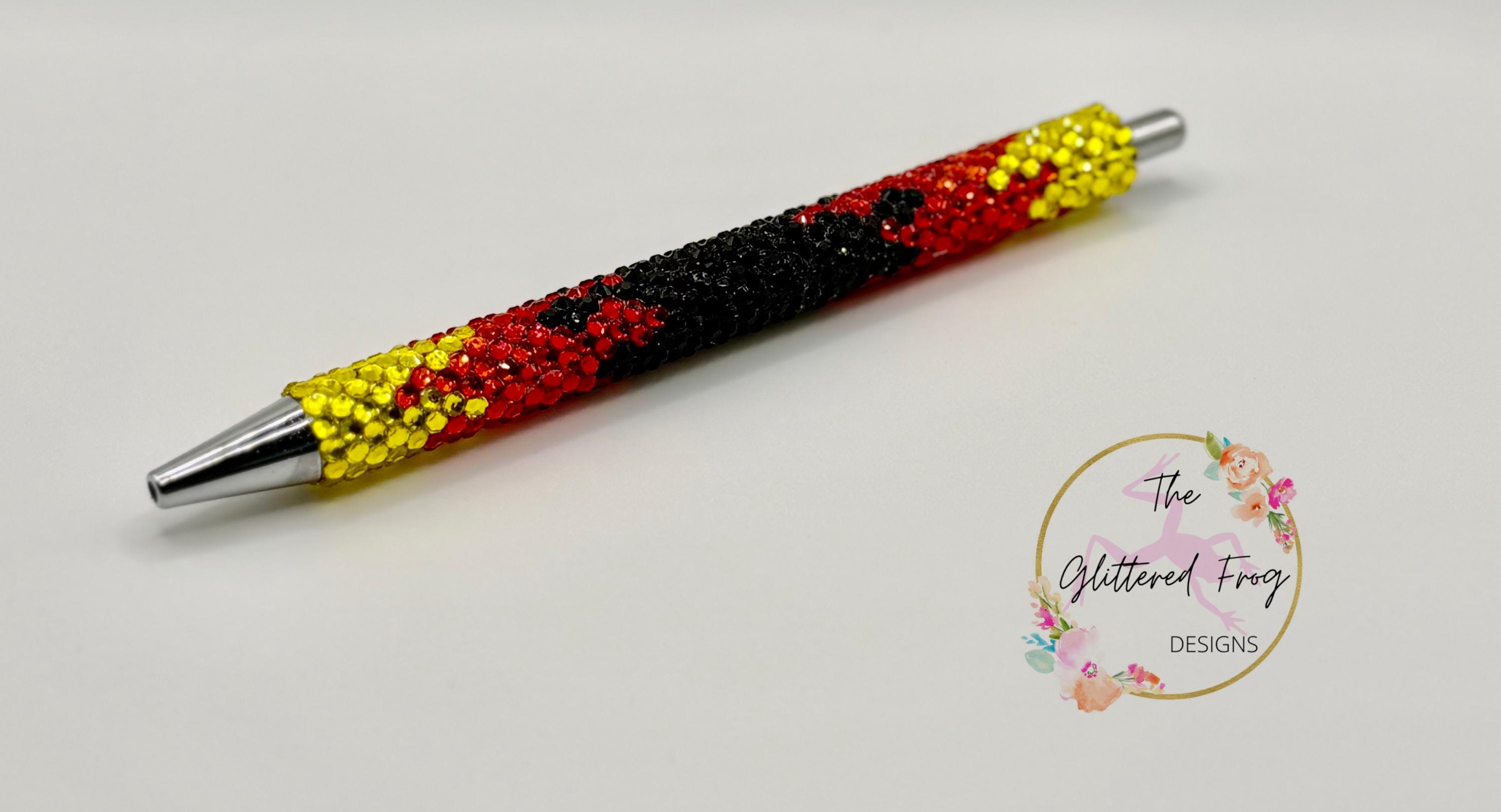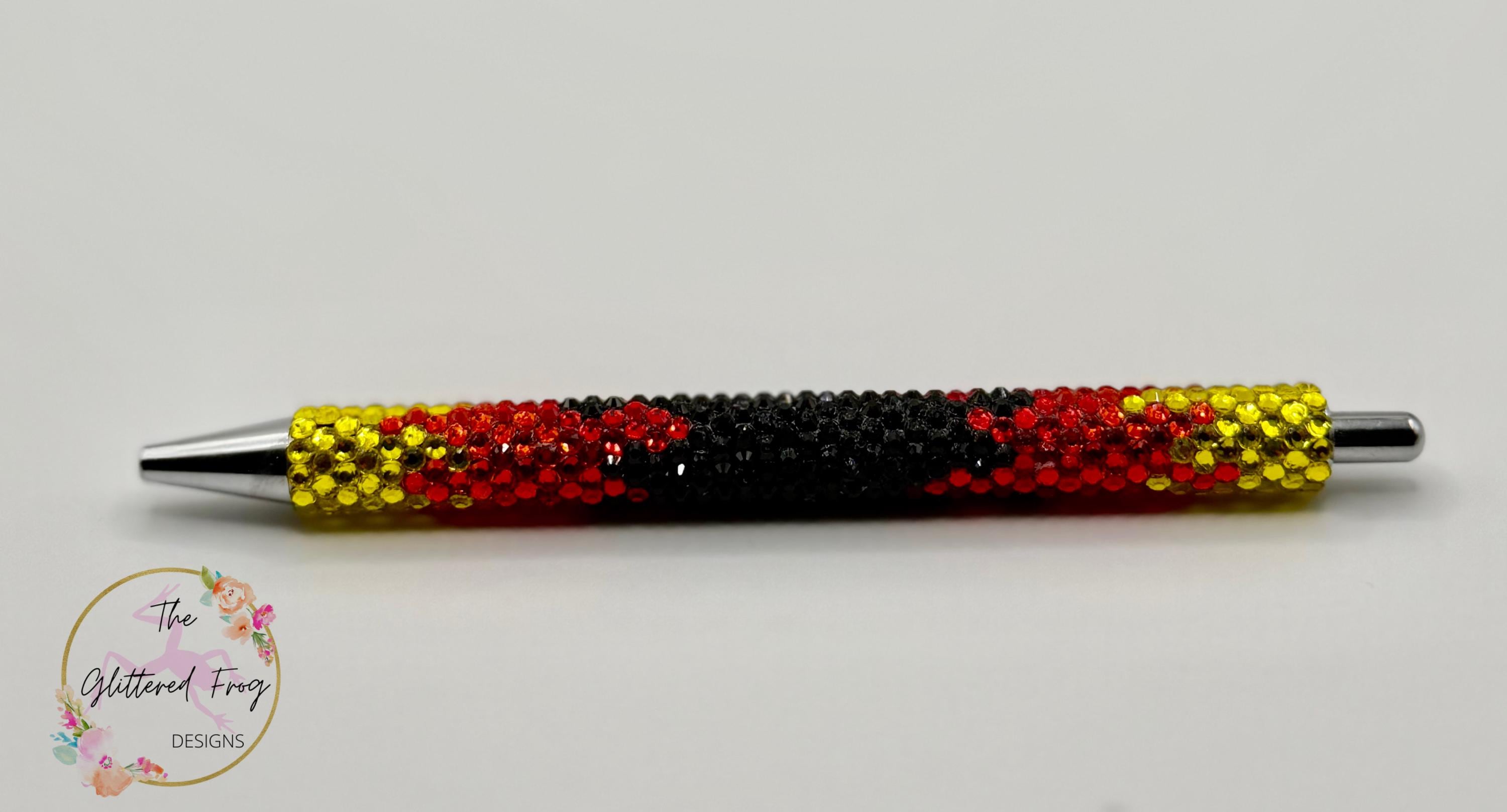 Rhinestone pen highlighting sparkling flames on a black background. The red, orange and yellow rhinestones shimmer brightly in the sun, while the black rhinestones offer a contrasting dull sparkle that compliments the shine beautifully.